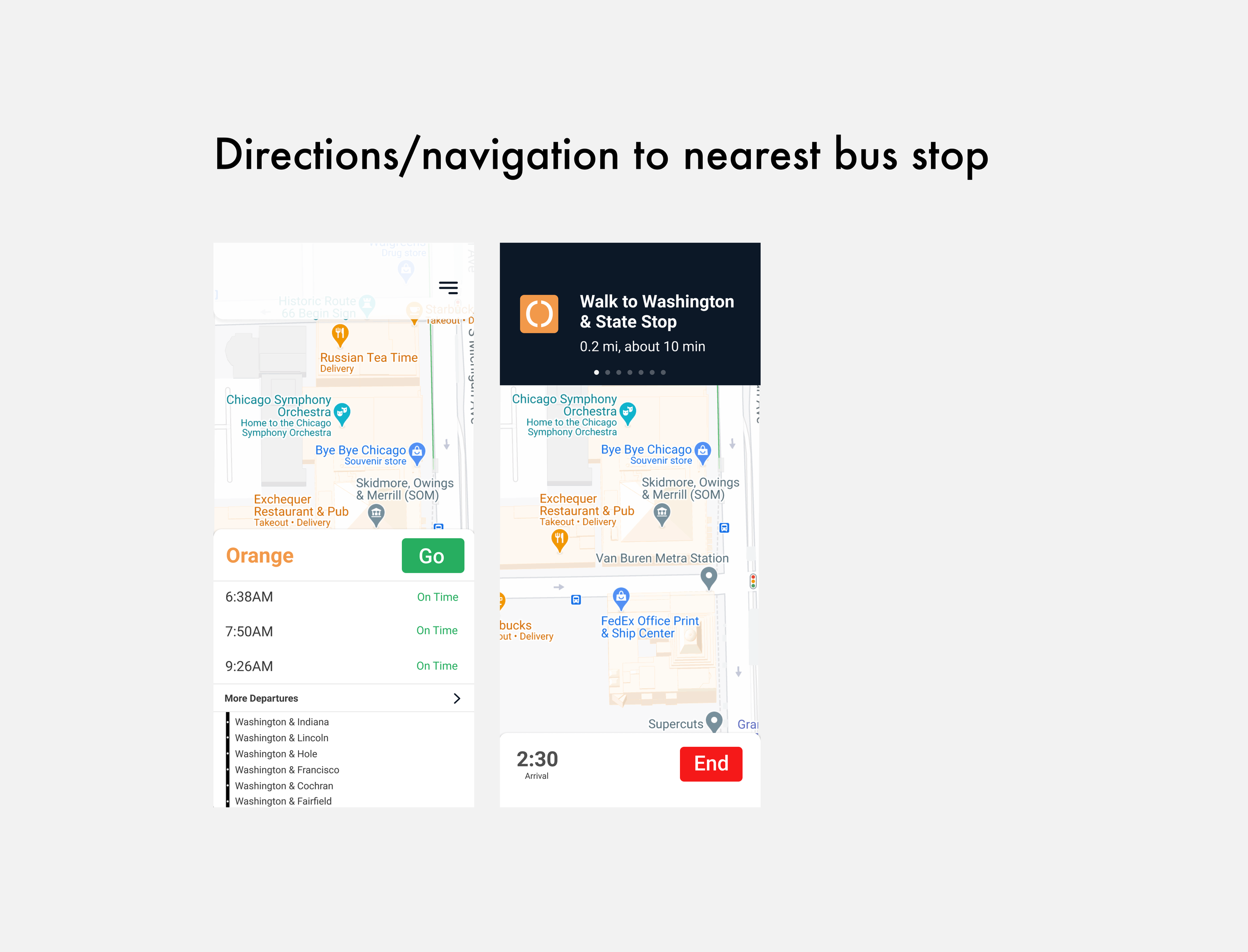 The City of Chicago has a network of public buses, and they currently list the expected bus schedules on their website and at each bus stop. However, as any bus rider knows, expected bus times are rarely accurate due to traffic, extended stops for passengers with accessibility needs, or maintenance issues. A citywide survey revealed a clear need for a mobile app that would give Chicago citizens real-time transit updates to improve their experience.
